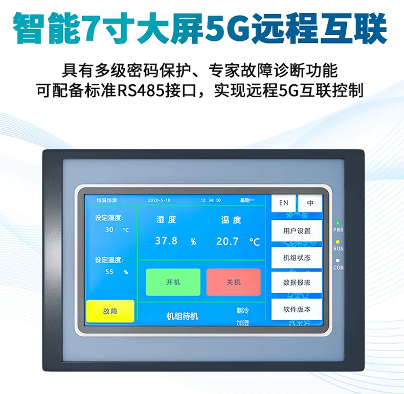 控制系統(tǒng):7寸液晶智能觸控屏顯示,全中文顯示: 溫濕度曲線直觀顯示;運行狀態(tài)直觀顯示; 可同時讀取所有機組和各項技術參數(shù)、運行狀態(tài)警告情況 電源相序保護和缺相保護,電源斷電后來電自啟功能。配置RS485 通訊協(xié)議及接口,可以并入環(huán)境集中監(jiān)控總網(wǎng),免除維護人員的巡視工作,還可選配遠程監(jiān)控功能,實現(xiàn)遠程查看數(shù)據(jù)及控制。