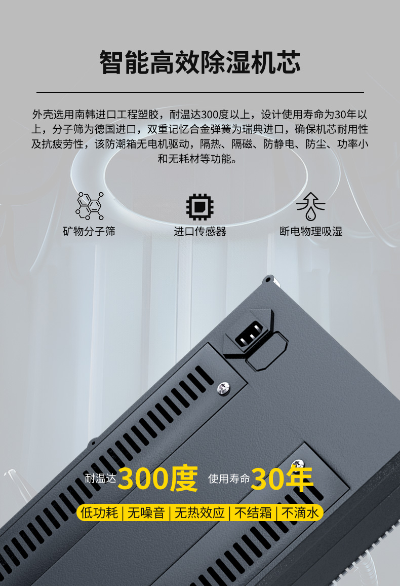 控濕機芯:外殼選用南韓工程塑膠,耐溫達300度以上,設計使用壽命為30年以上,分子篩為德國進口,雙重記憶合金彈簧為瑞典進口,確保機芯耐用性及抗疲勞性; 該防潮箱無電機驅(qū)動,隔熱﹑隔磁﹑防靜電﹑防塵﹑防盜﹑功率小和無耗材等功能,因此,該防潮箱具有環(huán)保﹑節(jié)能﹑靜音﹑無污染、不滴水。